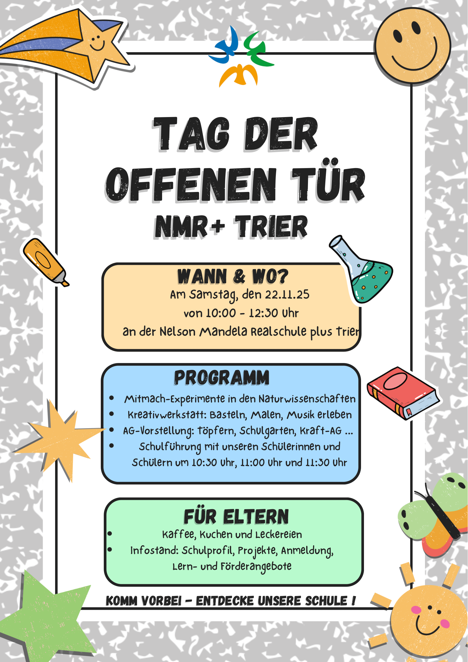Im Zeitraum vom 03. Februar 2025 bis 05. März 2025 finden die Anmeldungen für das kommende fünfte Schuljahr statt. Bitte vereinbaren Sie über das Sekretariat einen Anmeldetermin (info@nmr-trier.de). Das Anmeldegespräch führen wir mit Ihnen und Ihrem Kind. Bitte bringen Sie folgende Unterlagen mit: